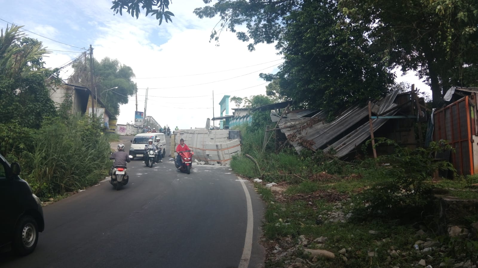 “Itu dia dari Serpong mau lewat ke arah Jombang. Kayaknya truknya ngga kuat, dan akhirnya mundur lagi, supirnya pun panik. Dan akhirnya terguling. Dia bawa hable buat nembok itu bang,” ucapnya