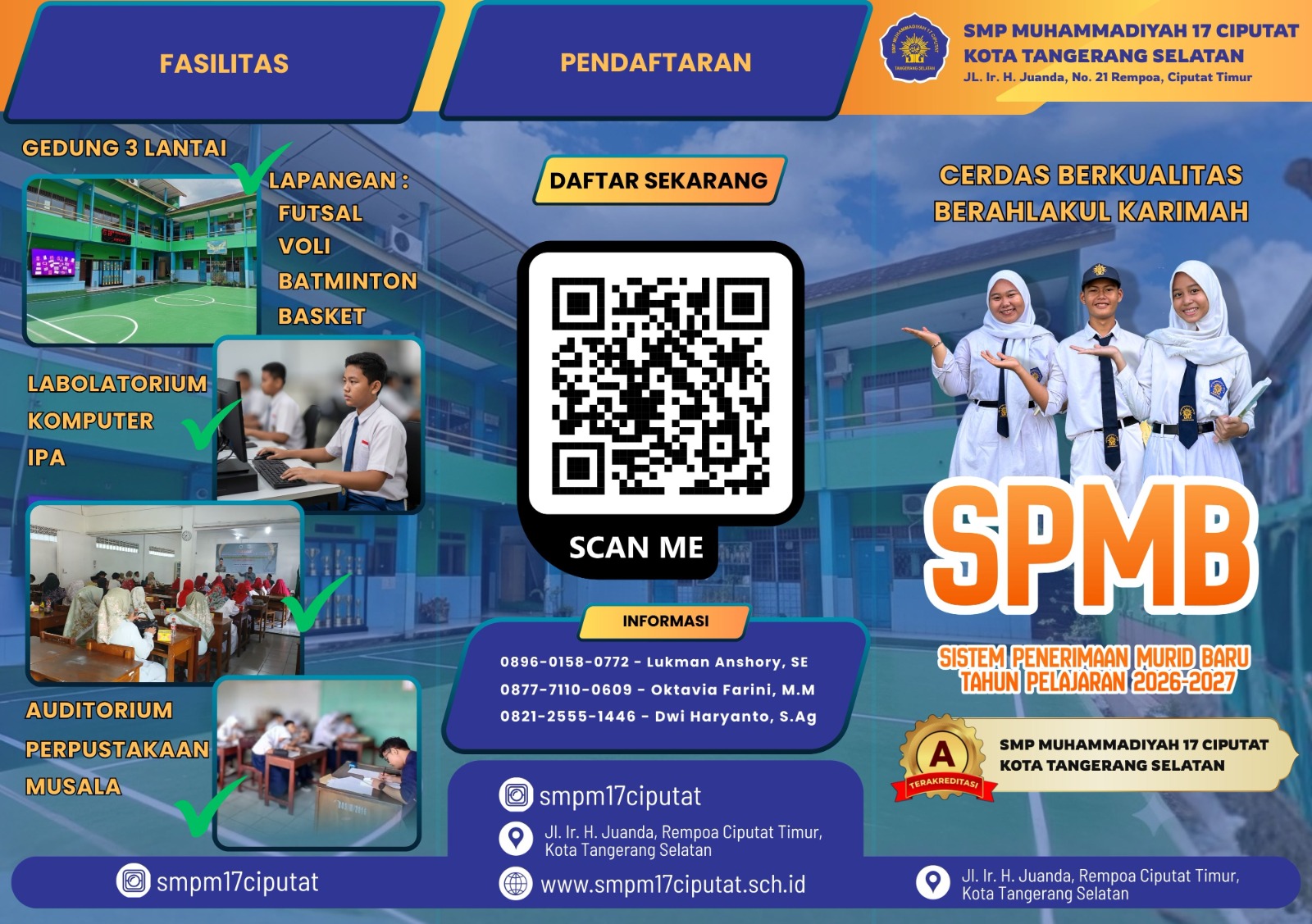 SMP Muhammadiyah 17 Ciputat resmi membuka Sistem Penerimaan Murid Baru (SPMB) Tahun Pelajaran 2026–2027. Pembukaan pendaftaran ini menjadi bagian dari komitmen sekolah dalam menghadirkan pendidikan yang cerdas, berkualitas, dan berakhlakul karimah bagi masyarakat, khususnya di wilayah Ciputat dan sekitarnya.